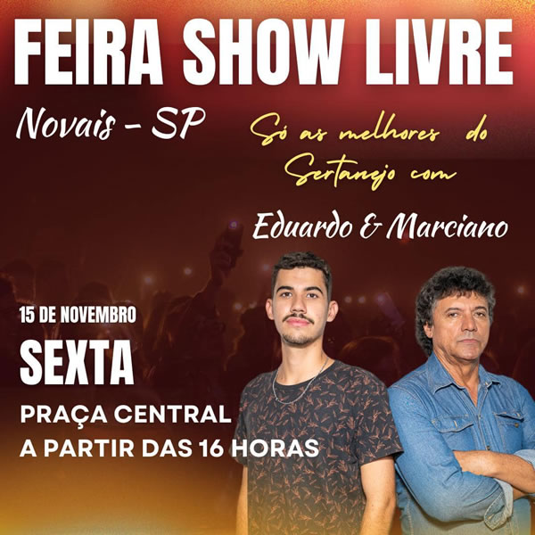 Neste feriado de 15 de novembro tem feira em Novais! Será ali na praça central, a partir das 16h, com show da dupla Eduardo e Marciano. Venha prestigiar!