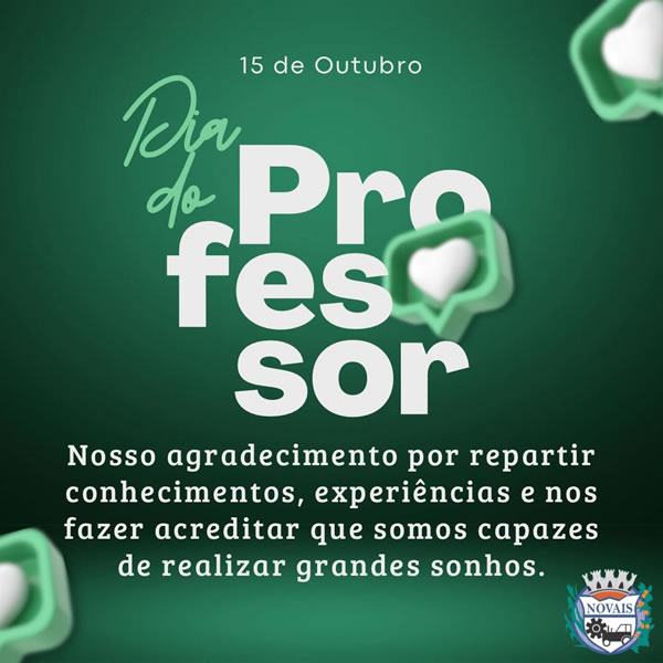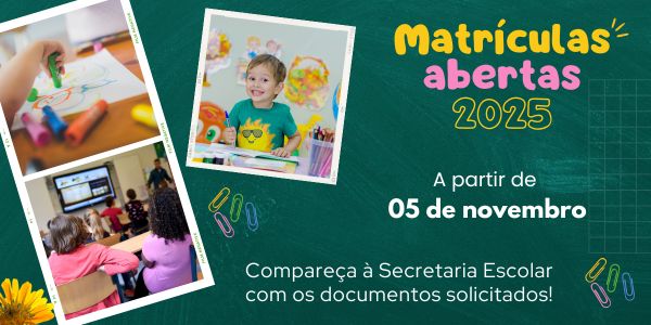 A Diretoria Municipal de Educação de Novais comunica aos senhores pais e responsáveis, que se encontram abertas as matrículas e rematrículas para o ano de 2025. A partir de 05 de novembro, das 8h às 17h, compareça à Secretaria Escolar, na Praça Lourenço Gil Martins, nº 33.