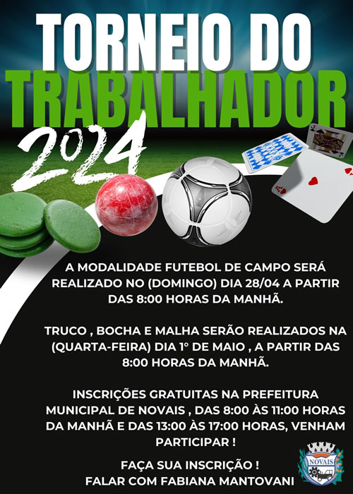 Torneio do Trabalhador 2024 Publicado em 24 de abril de 2024. Categoria: Esportes. Vem aí o Torneio do Trabalhador 2024. Faça sua inscrição na Prefeitura Municipal.