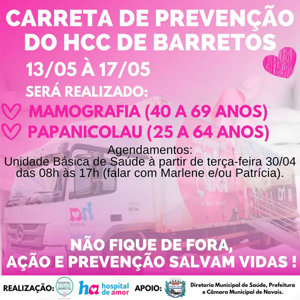 A carreta do HCC estará em Novais de 13 a 17 de maio, realizando mamografia e papanicolau. Faça seu agendamento na Unidade Básica de Saúde.