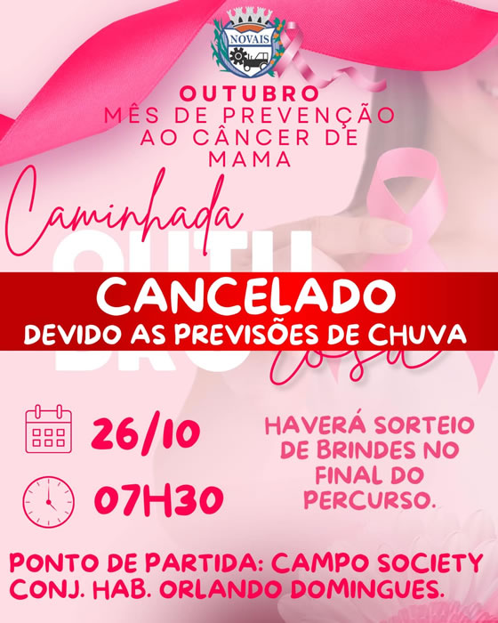 Devido às condições climáticas, com previsão de chuvas para o fim de semana, o evento Caminhada Outubro Rosa foi cancelado. Agradecemos a compreensão de todos!