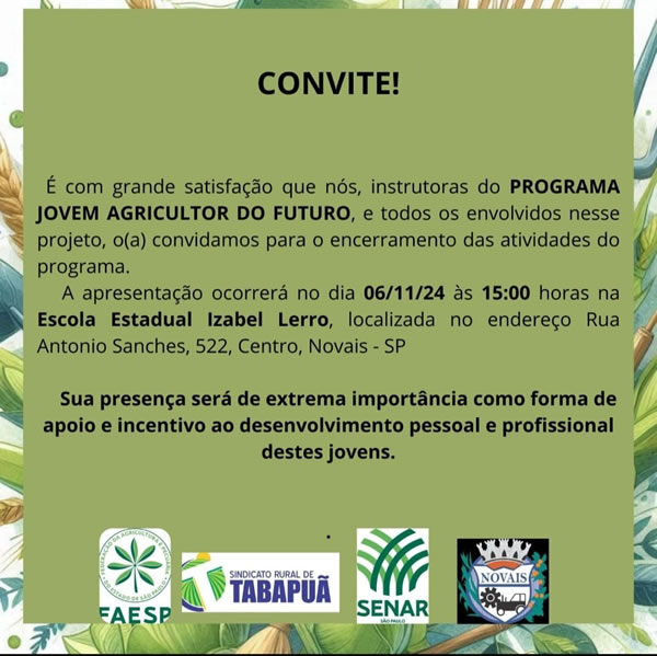 Participe da apresentação de encerramento das atividades do Programa Jovem Agricultor do Futuro. Será no dia 06 de novembro, às 15h00, na Escola Estadual Izabel Lerro. Prestigie nossos jovens!