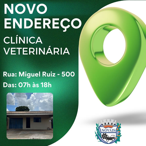 A clínica veterinária agora se encontra em novo endereço: na rua Miguel Ruiz, 500. O atendimento é das 07h00 às 18h00.
